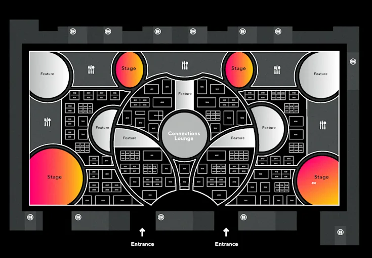 Our organic layout based on circles encourages exploration and helps attendees find the companies they need to meet. It creates multiple routes to every spot in the show and helps booths to live side by side with interactive features, stages and meeting spaces.